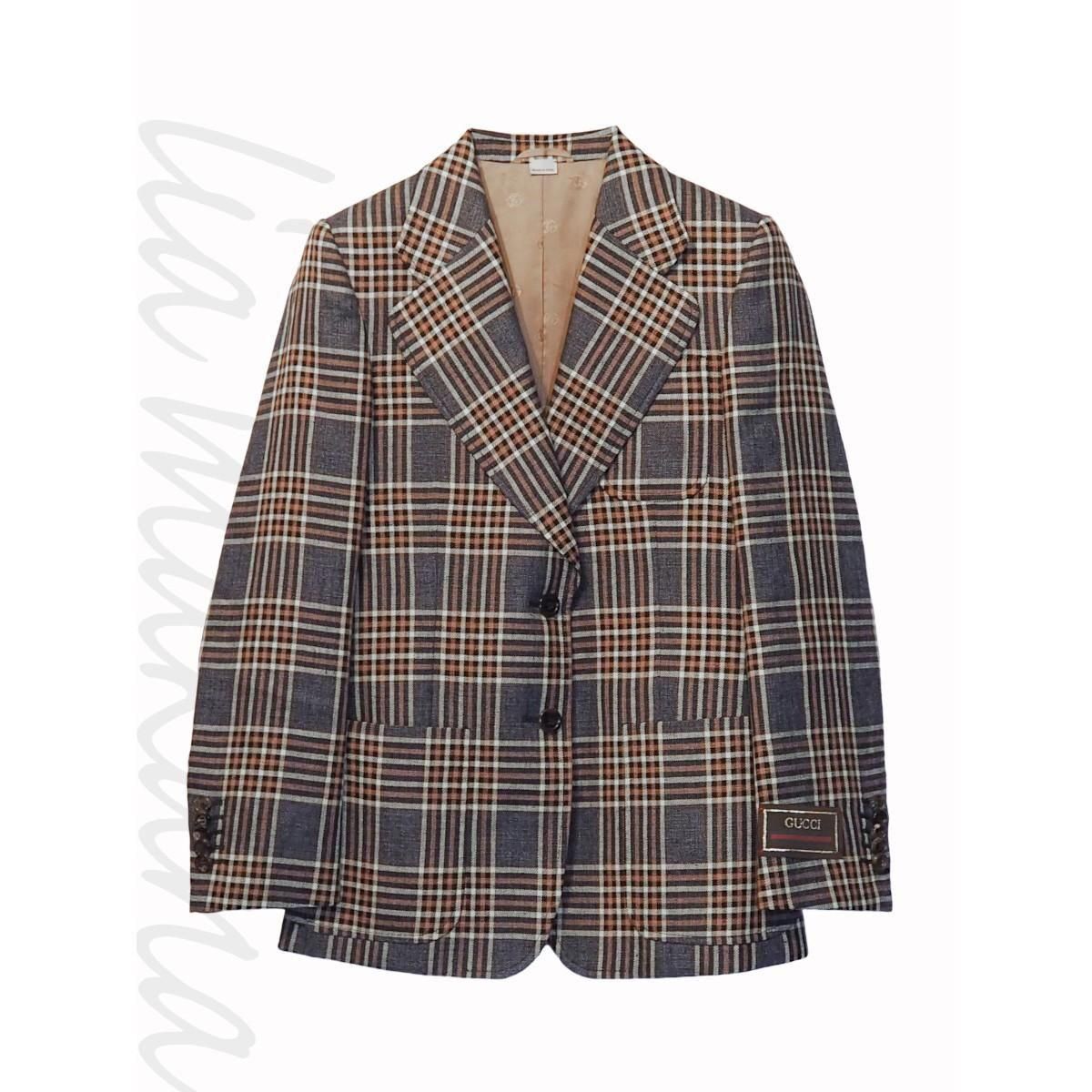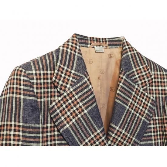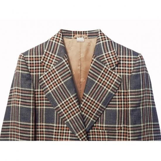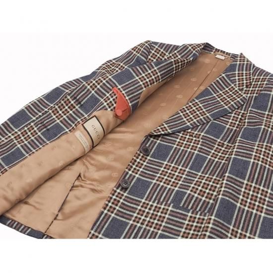 すっきりとしたシェイプに仕立て、チェック柄がコーデの主役になる「ジャケット」。裏地にグッチと分かる象徴的なロゴが覗く、ビジネスシーンからタウンユースまでカジュアルに着こなせるアイテムでございます。