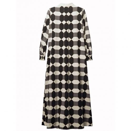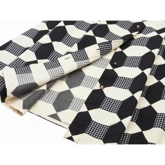 グラフィカルな幾何学模様を全面に施した「ドレス」。胸元のプリーツデザインが印象的なロング丈のシルエットに、ベルトでウエストラインを際立たせたエレガントなアイテムでございます。